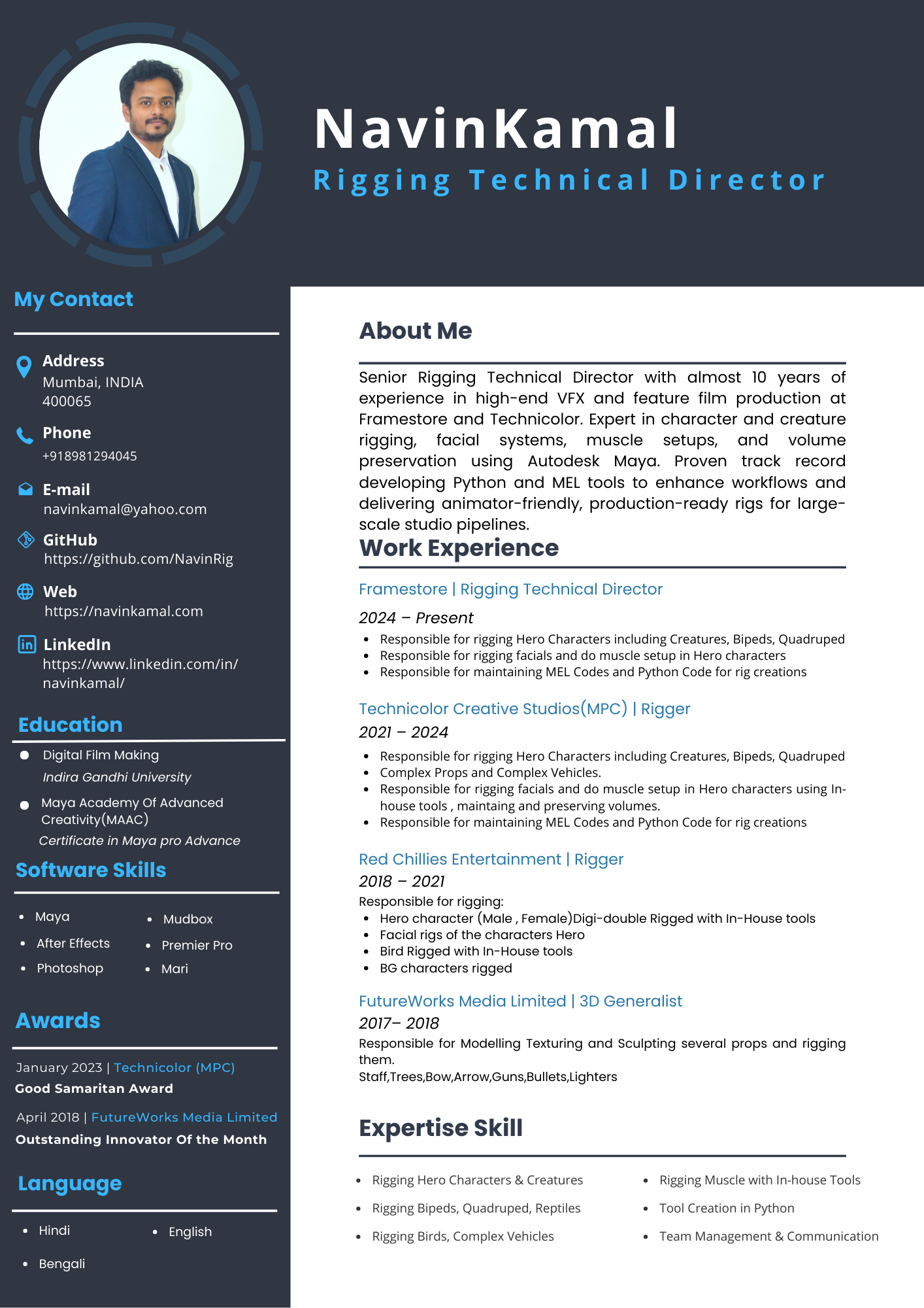 ContactNavin RESUME PDF DOC IMG Contact Info Navin Kamal Email Me navinkamal@yahoo.com Call Me +91-8981294045 Address​ Mumbai, 400065, INDIA Linkedin-in Youtube Github